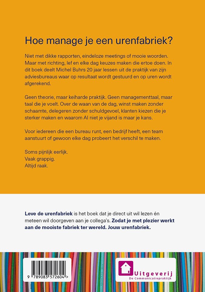 Leve de urenfabriek is het boek dat je direct uit wil lezen én meteen wil doorgeven aan je collega’s. Zodat je met plezier werkt aan de mooiste fabriek ter wereld. Jouw urenfabriek.