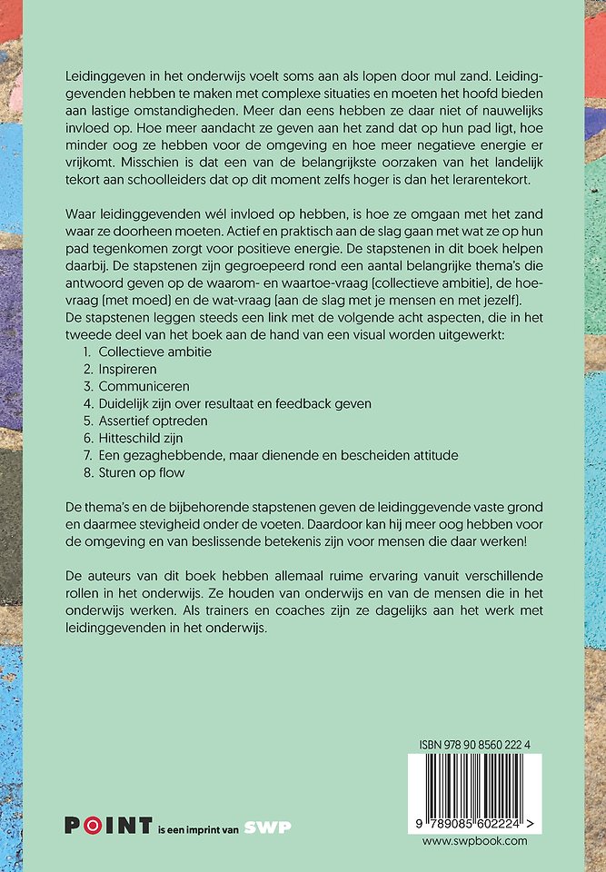 Waar leidinggevenden wél invloed op hebben, is hoe ze omgaan met het zand waar ze doorheen moeten. Actief en praktisch aan de slag gaan met wat ze op hun pad tegenkomen zorgt voor positieve energie. De stapstenen in dit boek helpen daarbij. De stapstenen zijn gegroepeerd rond een aantal belangrijke thema’s die antwoord geven op de waarom- en waartoe-vraag (collectieve ambitie), de hoe-vraag (met moed) en de wat-vraag (aan de slag met je mensen en aan de slag met jezelf).