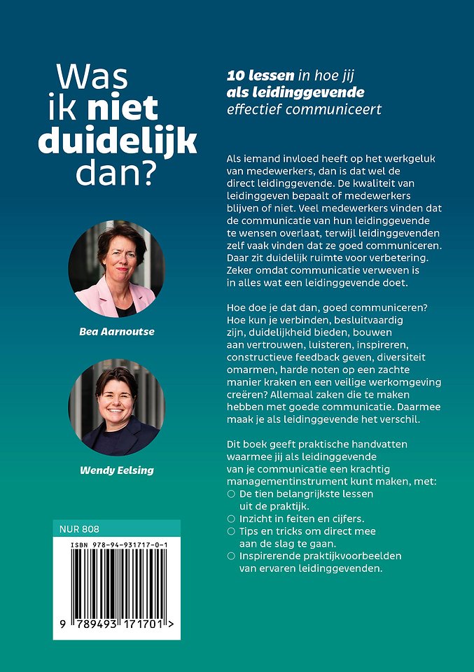 Meer over de auteurs'Was ik niet duidelijk dan?' 10 lessen in hoe jij als leidinggevende effectief communiceert. Als iemand invloed heeft op het werkgeluk van medewerkers, dan is dat wel de direct leidinggevende. De kwaliteit van leidinggeven bepaalt of medewerkers blijven of niet. Veel medewerkers vinden dat de communicatie van hun leidinggevende te wensen overlaat, terwijl de leidinggevenden zelf vaak vinden dat ze goed communiceren.
